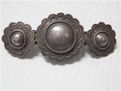 COMMENTS: FABULOUS RARE TO FIND Fred Harvey COIN / STERLING SILVER with LOADS OF classic stamping encircling three large repousse’ conchas. The hair attachment apparatus is not silver as expected. Perfect for a NICE GIFT for yourself, a loved one OF ANY AGE, or keep for your display; it has a LOW PRICE and FREE SHIPPING too !