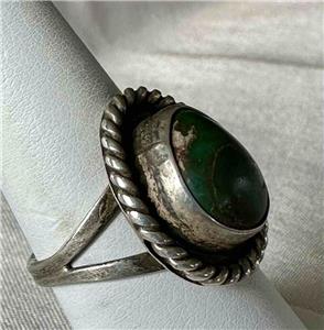 Classic Fred Harvey Native American Design sterling silver with greasy green turquoise ring.  Both the face of the ring and the stone are irregular shaped.  The edge of the face is decorated with a rope design and a darkened surface to highlight the stone.  The stone measures about 1/2″ tall by 7/16″ wide. The ring face measures roughly 7/8″ tall by 11/16″ wide. Ring size 6.75. We will wrap securely and mail it in a shipping box. We will be happy to answer any questions.