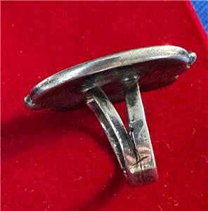 Ornate Fred Harvey Era Native American Design sterling silver with greasy green turquoise ring. This is a situation where description is difficult, the attached photos will better describe the ring. The stone is oval shaped and measures about 5/8″ tall by 5/16″ wide and is surrounded by a rope like design. The ring face measures roughly 1-1/4″ tall by 1″ wide. The ring is now a size 5.75 but if the band were further rounded it would be slightly larger, but I fear that procedure would damage the soldered joints. It weighs 9.3 grams. We will wrap securely and mail it in a shipping box. We will be happy to answer any questions.