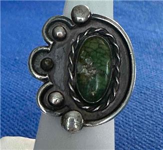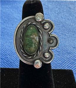 Fred Harvey Era Ornate Greasy Green Turquoise & Sterling Ring 5.75