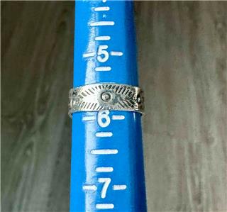 Fred Harvey Era Southwest design sterling silver and turquoise ring.  The back of the wide band is nicely decorated.  The stone has some interesting inclusion in its matrix. The turquoise stone measures roughly 11/16″ long by 15/16″ wide, is oval shaped and bezel set. The ring face measures roughly 13/16″ tall by 11/16″ wide. Ring size 5.75.  It weighs 6.7g.  We will wrap securely and mail it in a shipping box. We will be happy to answer any questions.