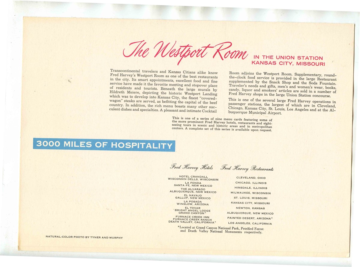 Dated September 7, 1957, Has a front cover of The Westport Room in the Union Station in Kansas City, Missouri. From the Fred Harvey 3000 Miles of Hospitality Series.