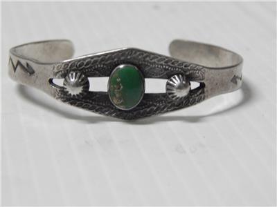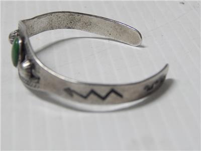 A CLASSIC look to this FRED Harvey era (c.1930s + ) Navajo bracelet. It has some more unique design detailing on the front portion, as well as twin conchas flanking the wonderful old green colored (due to age) turquoise stone set in an old time hand made bezel. Beautiful gift for your self or a loved one that will be quickly noticed each time it is worn and it has a LOW PRICE too !.