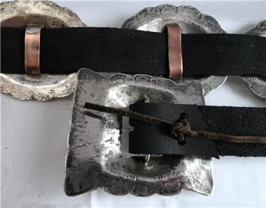 Conchos and buckle (found with solid black patina), have been professionaly cleaned to show the beauty of early design. Leather belt, not usable, has been replaced and measures 67″, with no belt holes punched. I’m happy to shorten it and add belt holes, if you give me your sizing.