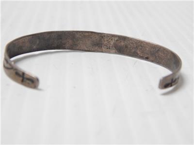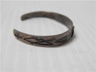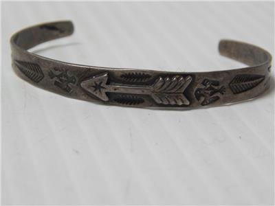 Perfect for a smaller wrist size or maybe a child. Prominent raised arrow design Thunderbirds, bows and arrows, etc. and other hand stamped designs highlight this c.1930s Fred Harvey era Navajo bracelet. A beautiful gift for your self or a loved one that will be quickly noticed each time it is worn and it has a LOW PRICE too !.